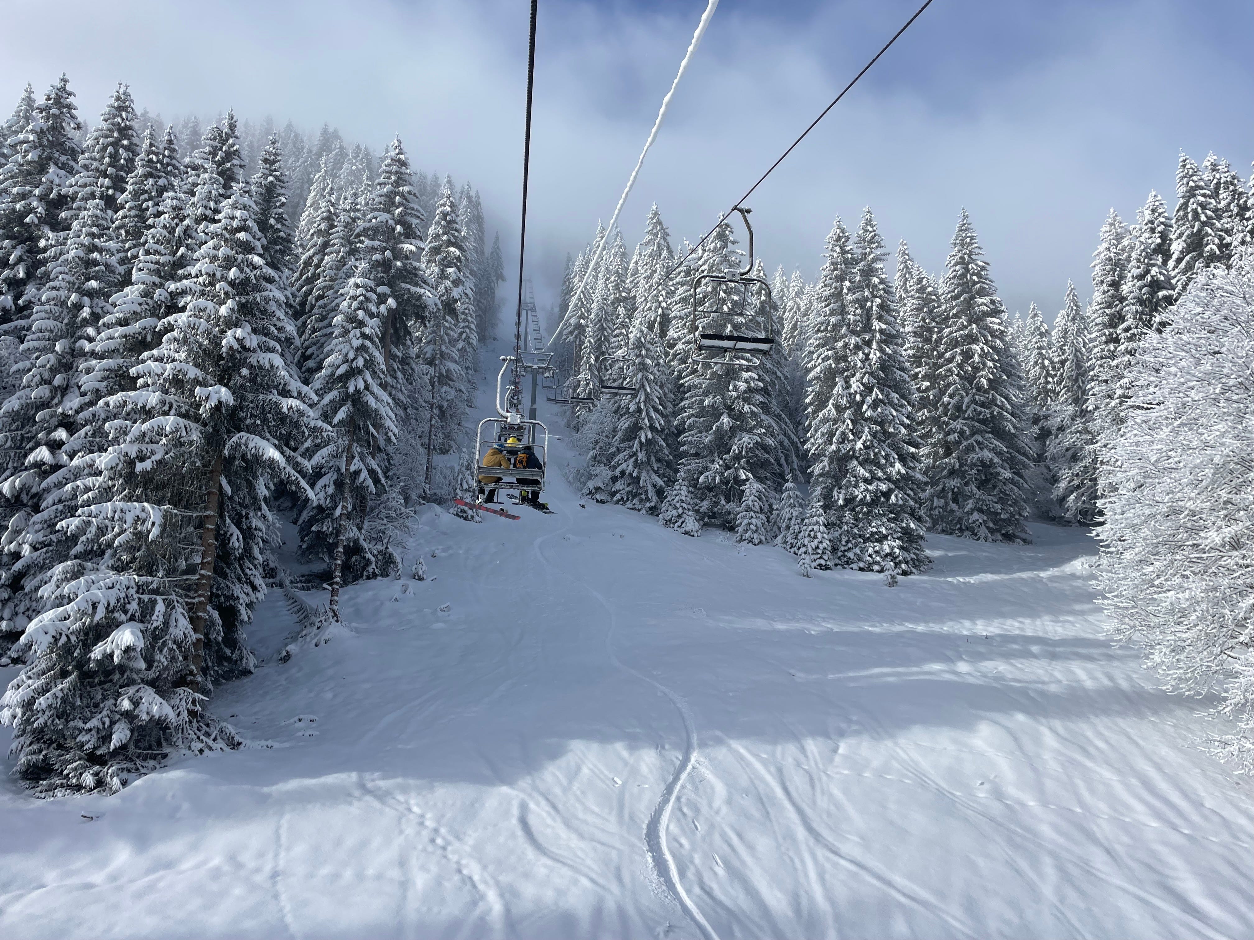 At the top of a ski lift, you might well be as close to heaven as one can be on earth. The snow is thick as anything. It looks like the cosiest bed. There is no other way to witness it — you have to drag on your boots and long johns and crunchy trousers and Michelin man it up the mountain on a cable car or a chair lift (a particularly special way to experience the cold — your fingers freezing trying to take a photo of the view and your nose so numb you can’t feel it dripping).