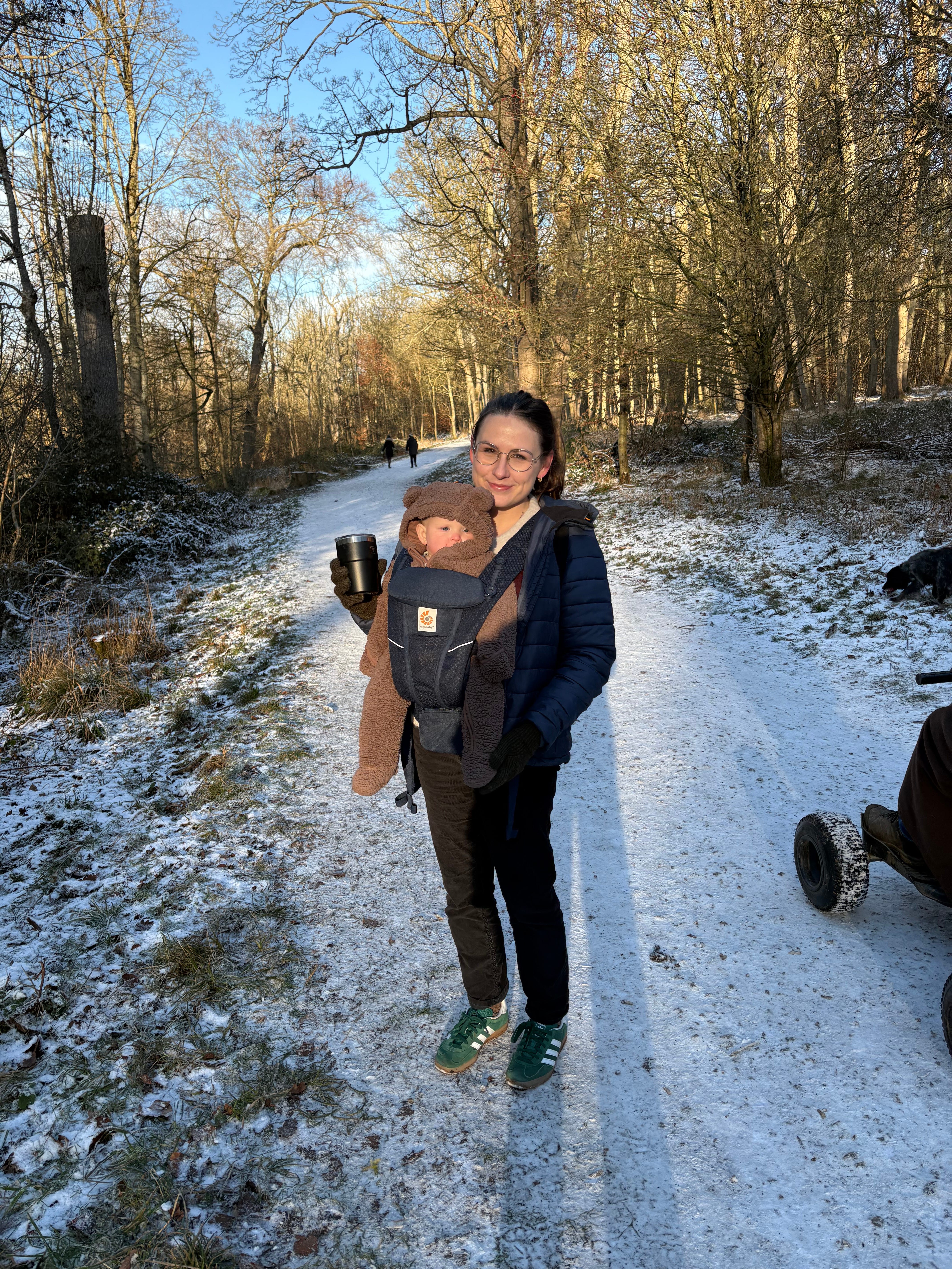 I’m not going to the mountains this year but I got a little taste of the thrill of it, when it snowed this week. Just a smattering. An embarrassing amount really. But it was white and it fell overnight and then didn’t disappear because the temperature stayed so wonderfully cold. The skies were primary blue. I walked through woods with my baby and my parents and the ground crunched under my feet. I left the house to find a cosy cafe to do some writing in and as I scraped the ice from my car windscreen, a woman walking by and I discussed the thick flakes falling on our heads. A point of connection, the cold. Very British.